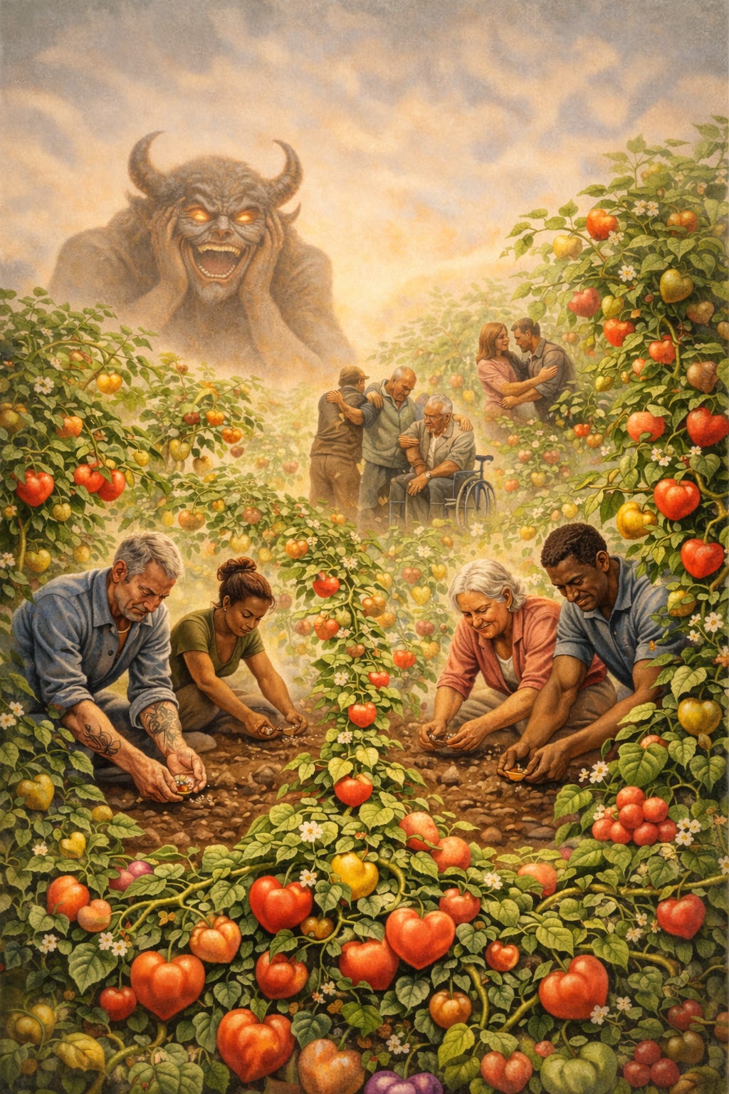 At least with the above you cease feeding the Hate Demon. In fact, this is what get’s me energized: starving the Hate Demon by ceasing to feed it while fueling the Love we all are capable of giving. Starving hate while simultaneously overrunning it with the sewn seeds of love and its inevitable fruit! (By the way, I know the below picture is super cheesy, but hopefully it makes the point).